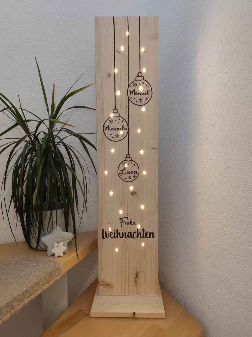 mit personalisierten Weihnachstkugeln. Wundervolle Dekoration in der dunklen Jahreszeit.